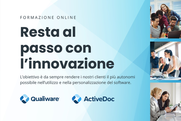 Da sempre crediamo che la crescita professionale passi attraverso la conoscenza. Per questo perseguiamo con convinzione l’obiettivo di fornire ai nostri clienti una formazione efficace che li renda realmente autonomi nell’utilizzo dei nostri sistemi. Siamo, quindi, lieti di annunciare la ripartenza dei nostri corsi di formazione online, un percorso pensato per chi desidera sviluppare nuove competenze e aumentare il proprio livello di autonomia nell’uso di Qualiware e ActiveDoc.